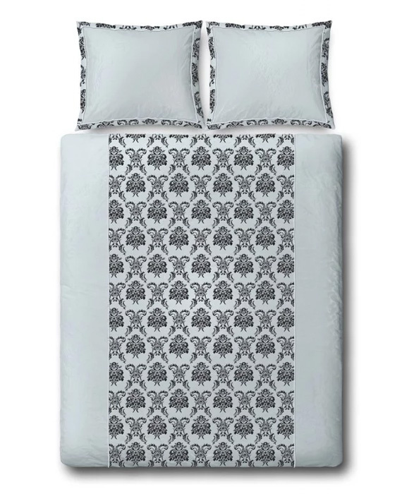 Dekbedovertrek Coco heeft een stijlvol zwart barok patroon op een licht blauwe achtergrond.