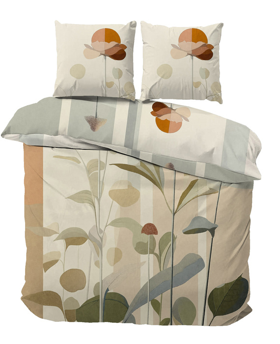 Dit stijlvolle overtrek kenmerkt zich door een verfijnd botanisch ontwerp met abstracte bloemen en bladeren in zachte aardetinten zoals beige, lichtgroen, roestoranje en zachtblauw. De subtiele verticale strepen op de achtergrond geven het geheel een modern en luchtig karakter.Het overtrek wordt geleverd met bijpassende kussensloop(en) en is voorzien van een dubbele instopstrook over de gehele breedte, waardoor je dekbedovertrek gemakkelijk is in te stoppen onder het matras. Daarnaast is het overtrek wasbaar en geschikt voor de droger.