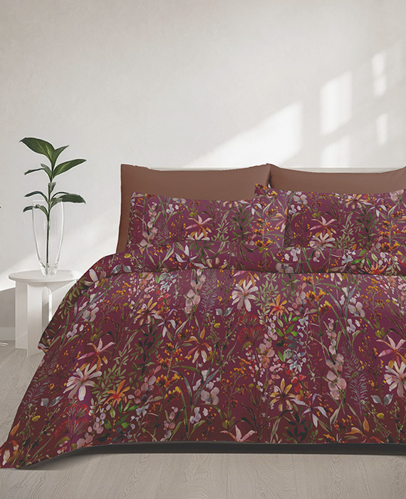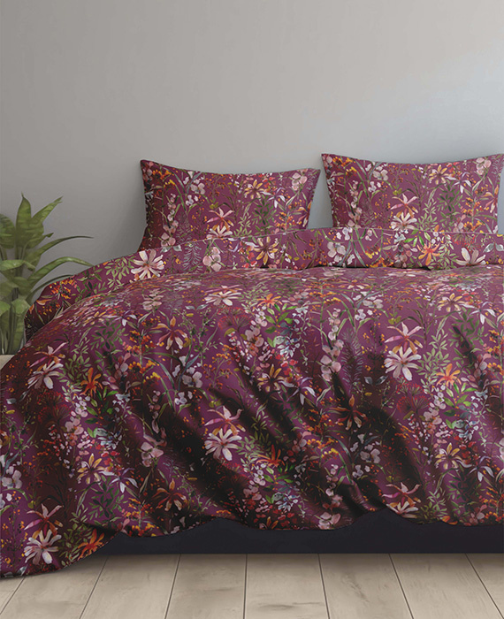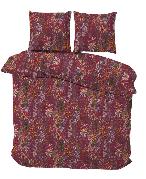 Dit opvallende overtrek heeft een rijk bloemendesign in levendige tinten zoals oranje, roze, groen en wit, die prachtig afsteken tegen de diepe bordeauxrode achtergrond. De combinatie van kleur en natuur geeft jouw slaapkamer direct een warme en romantische uitstraling.