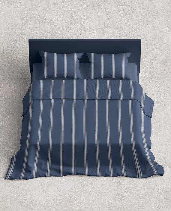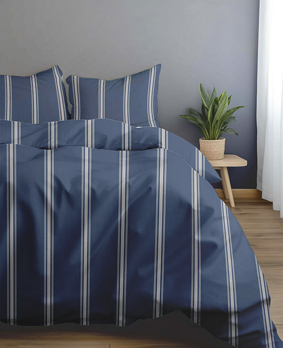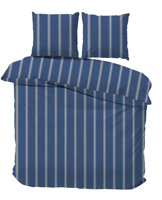 Het elegante verticale streeppatroon in wit en lichtgrijs geeft het overtrek een tijdloze uitstraling, terwijl de diepe blauwe kleur zorgt voor een kalme, frisse sfeer waarin je heerlijk tot rust komt.