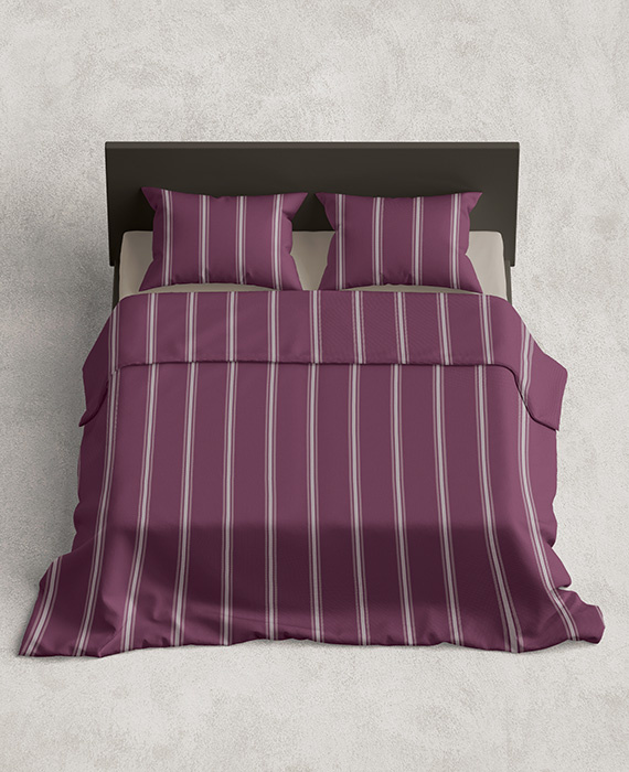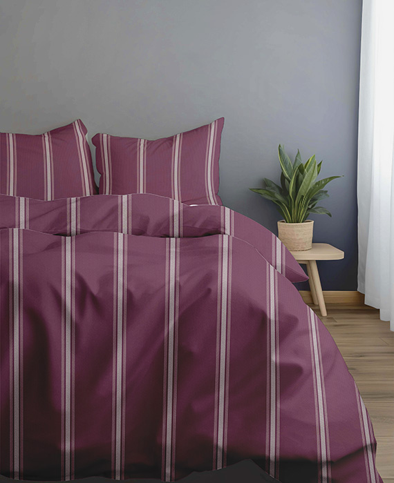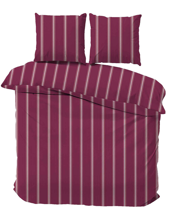 Het klassieke streeppatroon in wit en grijstinten zorgt voor een tijdloze uitstraling, terwijl de warme bordeauxrode kleur een gevoel van luxe en geborgenheid creëert. Perfect voor wie houdt van een moderne, maar toch elegante slaapkamerstijl.