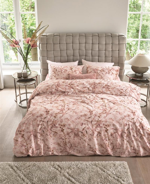 Rivièra Maison dekbedovertrek Blushing Blooms is een sfeervol overtrek bestaand uit allemaal takjes met bloeiende bloemen. Dit speelt zich af op een zachte roze achtergrond.